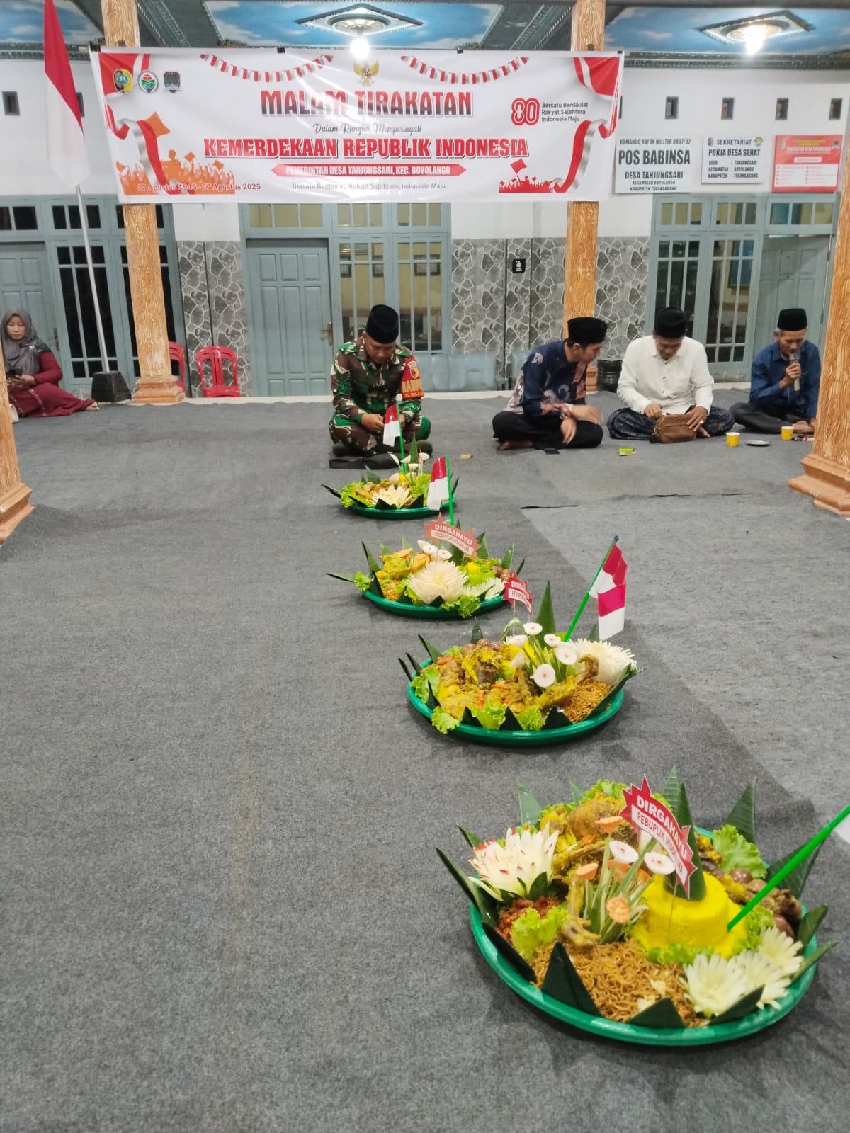 Dalam suasana malam yang khidmat, warga Desa Tanjungsari, Kecamatan Boyolangu, Tulungagung, menggelar tirakatan memperingati Hari Ulang Tahun Kemerdekaan Republik Indonesia ke-80 pada Sabtu malam (16/8/2025) di Balai Desa setempat. Kegiatan ini diisi dengan pembacaan Surah Yasin, tahlil, dan doa bersama untuk para pahlawan bangsa.