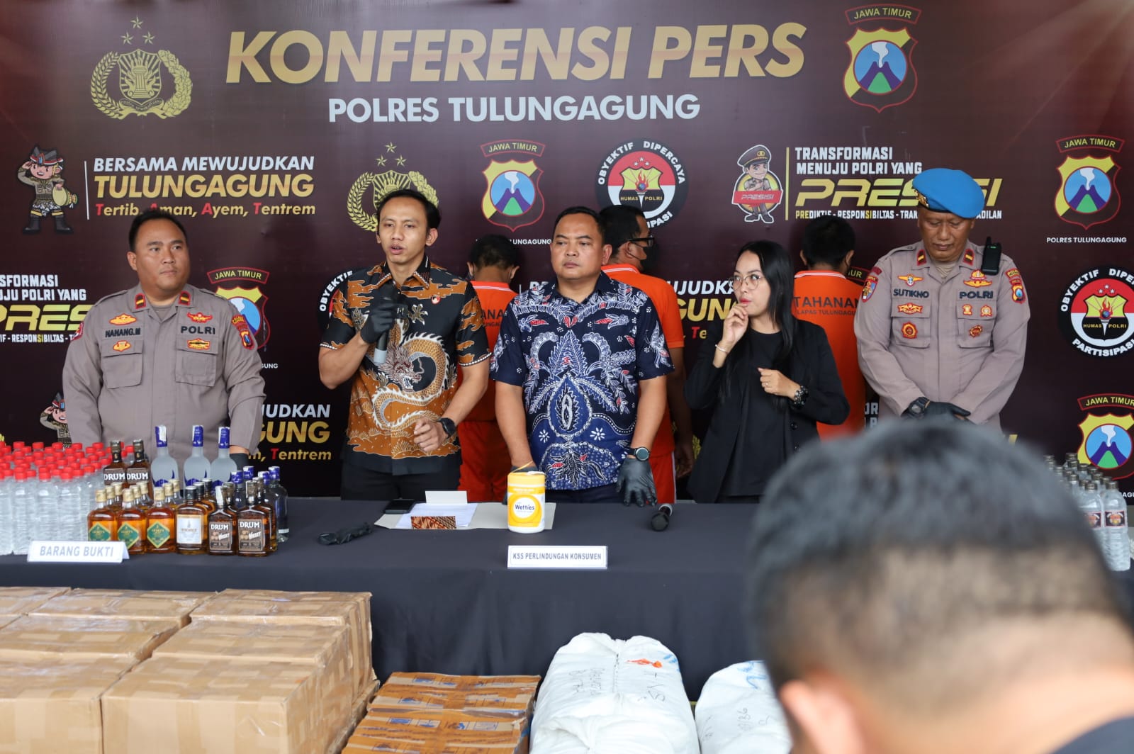 Polres Tulungagung menggelar konferensi pers pengungkapan jaringan peredaran minuman keras (miras) yang dipasarkan secara daring dengan sistem Cash on Delivery (COD), Jumat (07/11/2025). Pengungkapan ini merupakan hasil operasi gabungan Satreskrim dan Satnarkoba Polres Tulungagung.