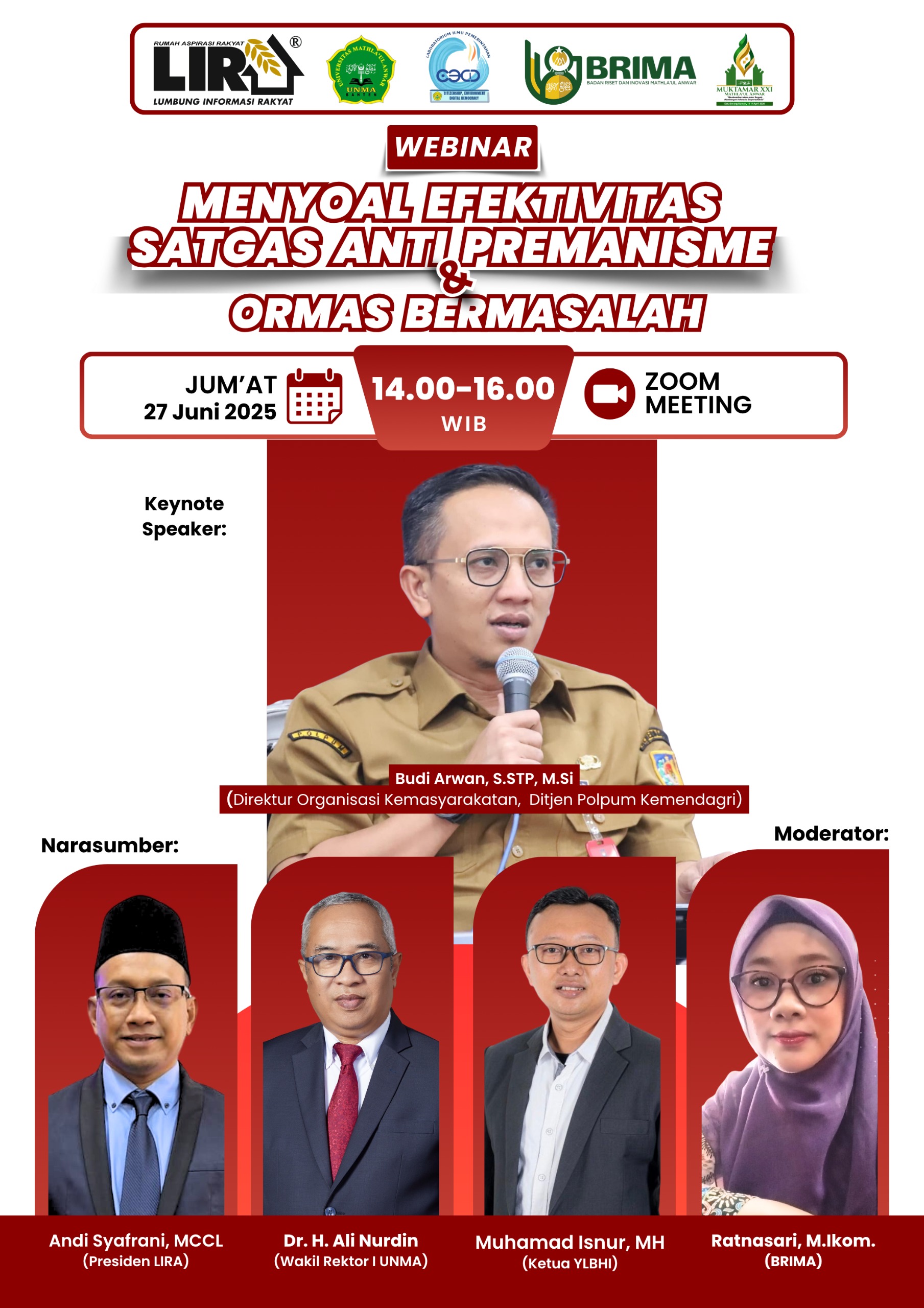 Lumbung Informasi Rakyat (LIRA), Badan Riset dan Inkvasi Mathla’ul Anwar (BRIMA), Univeristas Mathla’ul Anwar dan Laboratorium Ilmu Pemerintahan Universitas Sultan Ageng Tirtayasa (UNTIRTA) menggelar webinar bertajuk “Menyoal Efektivitas Satgas Anti Premanisme dan Ormas Bermasalah”, Jumat (27/6), melalui zoom meeting.