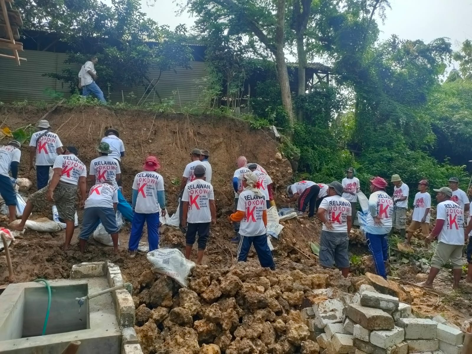 Karena dampak tanah longsor tersebut yang menimpa rumah warga dan pada pukul 8.00 wib pro relawan jokowi berjumlah 60 orang dengan kompak berbaur bahu membahu meratakan dan membuat tanggul.