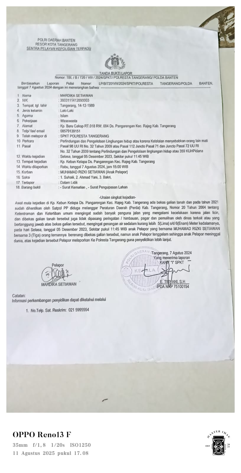 Orang tua korban telah melaporkan kasus ini ke polisi dengan nomor laporan LP/B/720/V111/2024/SPKT/POLRESTA TANGERANG pada 7 Agustus 2024. Namun, laporan tersebut tidak ditindaklanjuti dengan serius dan kini mandek.