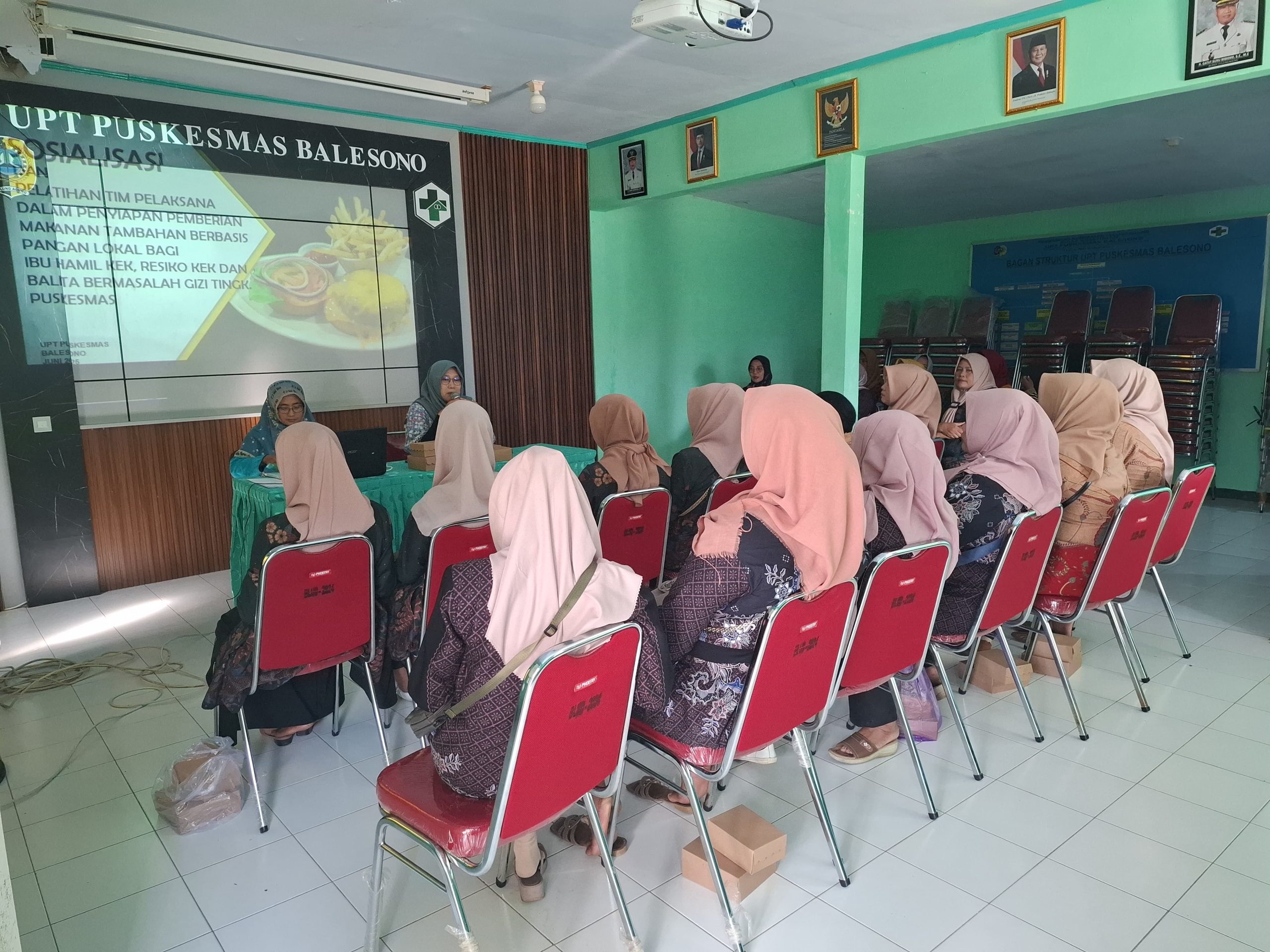 Sebagai bagian dari upaya percepatan penurunan angka kekurangan gizi dan stunting, UPT Puskesmas Balesono menyelenggarakan pelatihan persiapan Pemberian Makanan Tambahan (PMT) berbasis pangan lokal. Pelatihan ini ditujukan untuk balita gizi kurang, balita dengan berat badan kurang, balita T (tidak naik timbangan), serta ibu hamil dengan Kekurangan Energi Kronis (KEK).